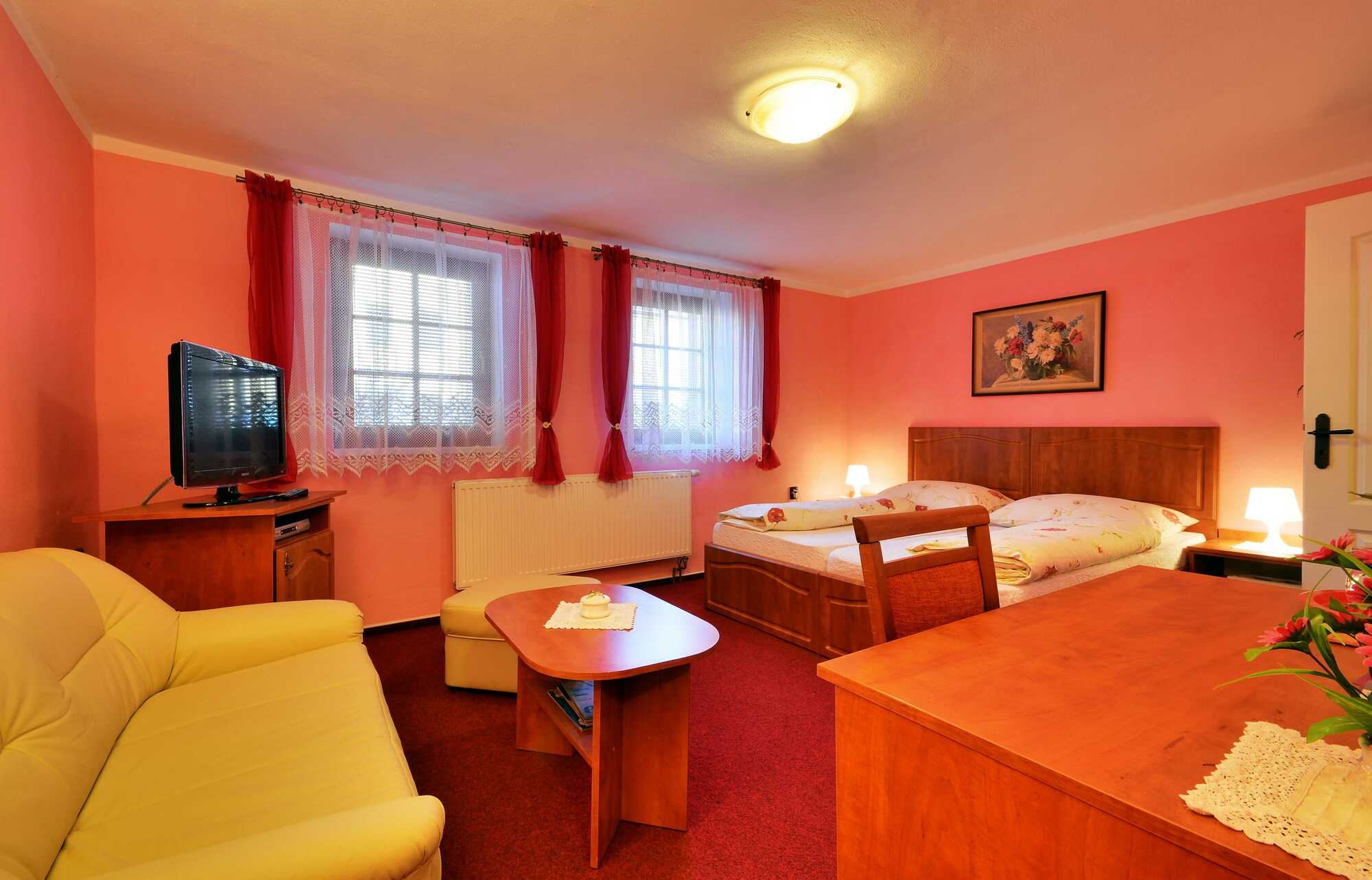 2lůžkový útulný nekuřácký pokoj s manželskou postelí. Hosté mají k dispozici samozřejmě vlastní koupelnu s wc, umyvadlem, sprchovým koutem a vířivou vanou. Na pokoji mohou hosté k pracovním účelům využít pracovní stůl či relaxovat u satelitní TV nebo v příjemném posezení na pohovce. Hosté se mohou občerstvit i z minibaru na pokoji.